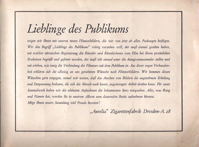 Angaben zum Sammel-Album „Bilder-Album 1“ von der Zigarettenfabrik Aurelia: |